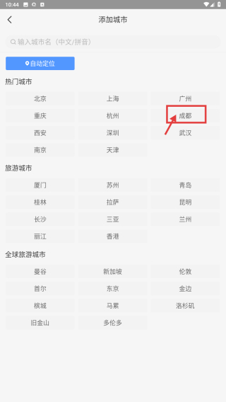 3、在城市選擇界面,找到成都并點(diǎn)擊,進(jìn)入成都天氣預(yù)覽頁(yè)。