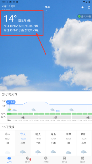 4、在成都天氣預(yù)覽頁(yè),查看當(dāng)?shù)貧鉁?、風(fēng)向、降水等詳細(xì)天氣信息。