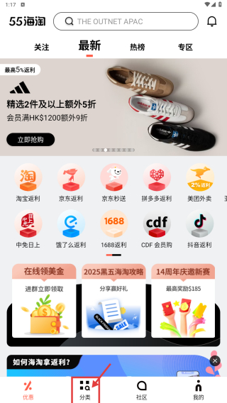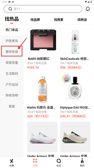 1、打開海淘優(yōu)惠應(yīng)用,點(diǎn)擊底部分類選項(xiàng),進(jìn)入商品分類頁面。