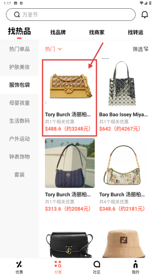 2、在商品分類頁面,點(diǎn)擊服飾包袋分類,瀏覽該分類下的商品列表。
