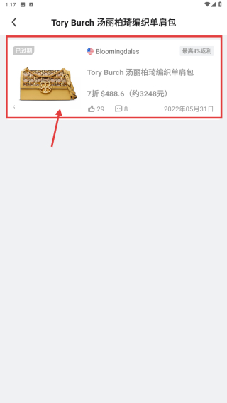 3、在商品列表里,找到Tory-Burch湯麗柏琦編織單肩包條目,點(diǎn)擊進(jìn)入商品詳情頁。