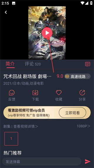 4、在動漫電影詳情頁,點擊播放按鈕即可觀看咒術(shù)回戰(zhàn)影片。