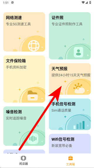 2、在工具箱頁面中,找到并點擊天氣預(yù)報選項。