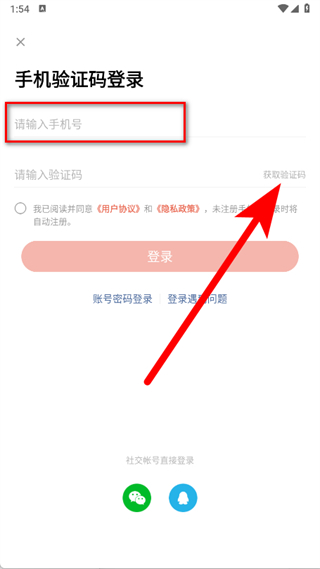 3、進入手機驗證碼登錄頁面,輸入手機號碼,點擊獲取驗證碼按鈕。