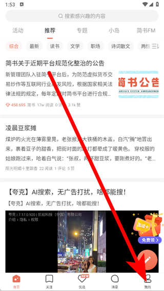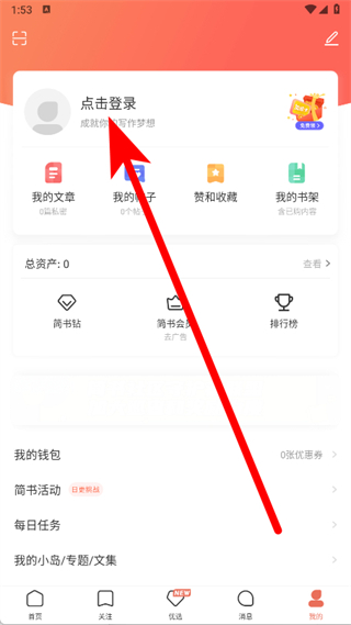 1、打開簡書,點擊頁面底部的我的,進入個人頁面。