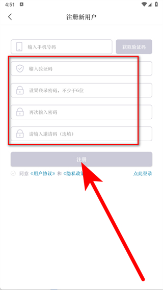 5、輸入驗(yàn)證碼,設(shè)置登錄密碼,再次輸入密碼,填寫邀請碼,勾選同意后,點(diǎn)擊注冊,完成新用戶注冊。