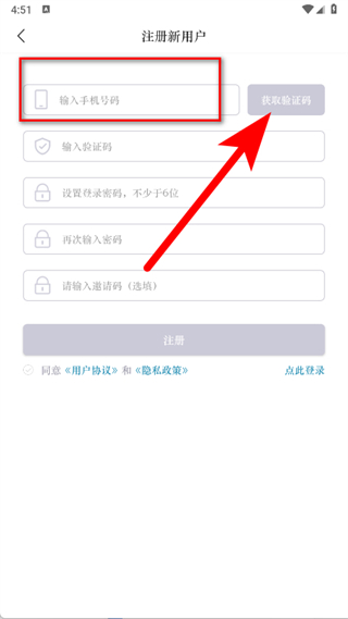 4、在注冊新用戶頁面,輸入手機(jī)號碼,點(diǎn)擊獲取驗(yàn)證碼。