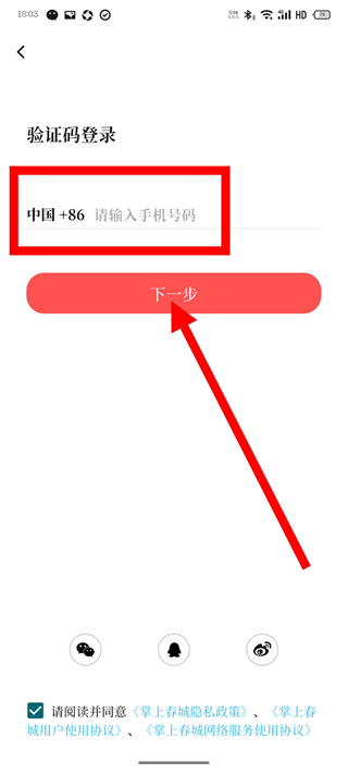 3、進(jìn)入驗(yàn)證碼登錄頁面,輸入手機(jī)號(hào)碼,點(diǎn)擊下一步。