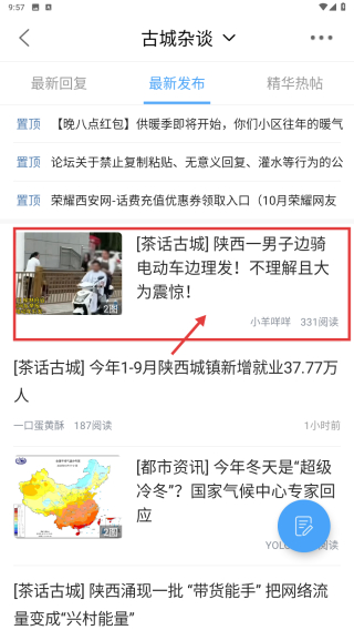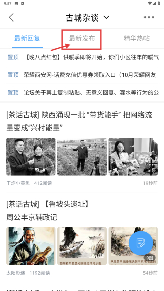 2、在古城雜談內(nèi)容頁面,點(diǎn)擊最新發(fā)布標(biāo)簽,瀏覽最新發(fā)布的資訊列表。
