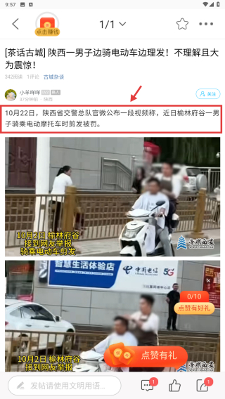 3、在資訊列表里,找到茶話古城陜西一男子邊騎電動(dòng)車邊理發(fā)!不理解且大為震驚!資訊條目,點(diǎn)擊進(jìn)入資訊詳情頁。