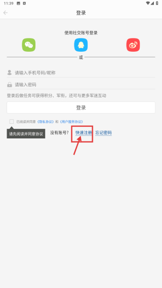 3、在登錄/注冊頁面,點(diǎn)擊快速注冊選項,進(jìn)入注冊頁面。