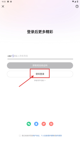 3、在登錄方式選擇界面,點(diǎn)擊密碼登錄選項(xiàng),進(jìn)入手機(jī)號(hào)密碼登錄頁(yè)面。
