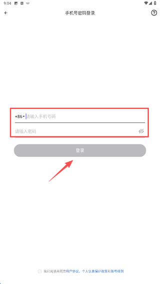 4、在手機(jī)號(hào)密碼登錄頁(yè)面,輸入手機(jī)號(hào)碼和密碼后點(diǎn)擊登錄按鈕,完成賬號(hào)登錄操作。