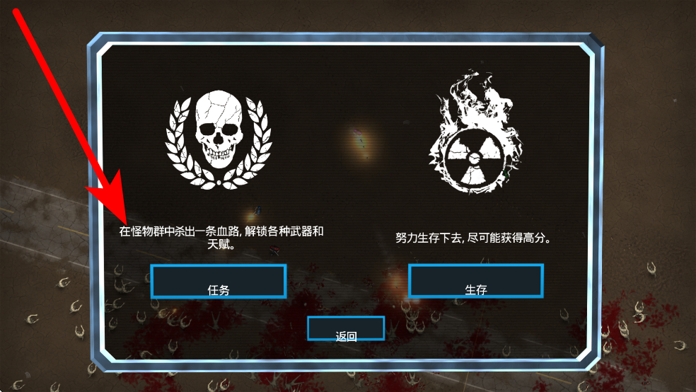 1、進(jìn)入游戲后,可在任務(wù)與生存模式中挑選,任務(wù)模式解鎖武器天賦,生存模式爭取高分。