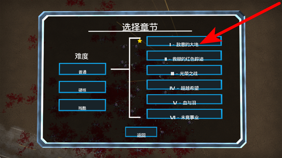 2、選章節(jié)時(shí)可從敵意的大地等多個(gè)章節(jié)中選擇,難度有普通、硬核、殘酷可選,玩家可以選擇自己喜歡的章節(jié)進(jìn)入游戲。
