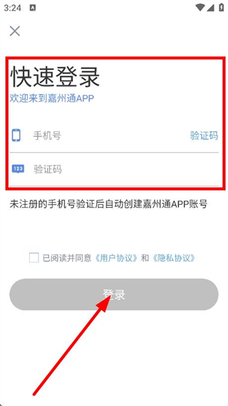 4、在快速登錄頁面,輸入手機號、驗證碼,點擊登錄,完成賬號登錄。