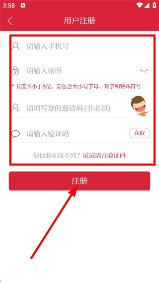 4、輸入手機(jī)號、密碼、驗證碼后,點擊注冊,完成賬號注冊。