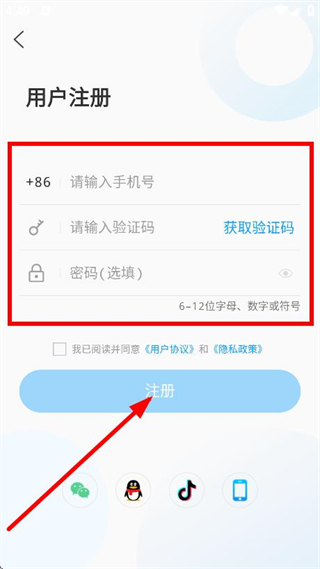 4、輸入手機(jī)號(hào)、驗(yàn)證碼、密碼,點(diǎn)擊注冊(cè),完成賬號(hào)注冊(cè)。