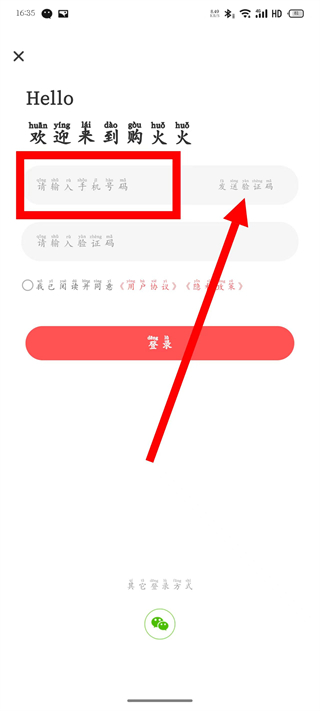 3、在登錄頁面,輸入手機號碼后,點擊發(fā)送驗證碼。