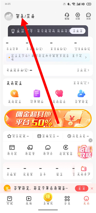 2、在個人中心頁面,點擊登錄注冊區(qū)域,進入賬號登錄界面。