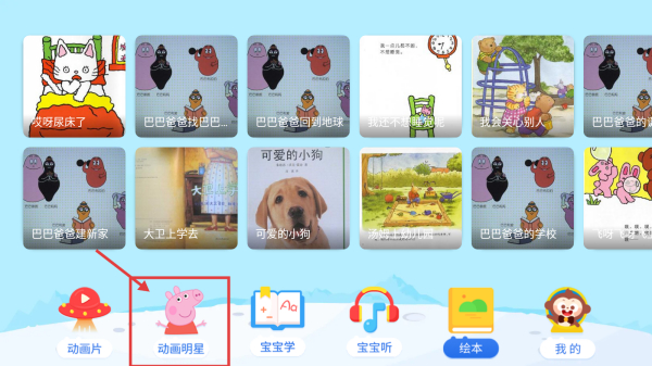 1、打開兒童動畫類應用,點擊底部動畫明星選項,進入動畫明星選擇頁面。