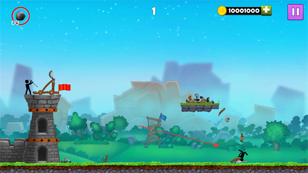 1、調(diào)整投石車角度,發(fā)射石彈攻擊敵方火柴人及投石車,消滅敵人獲取分數(shù)。