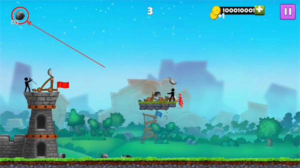 3、持續(xù)發(fā)射石彈,消滅更多敵方火柴人,提升分數(shù),推進游戲進程。