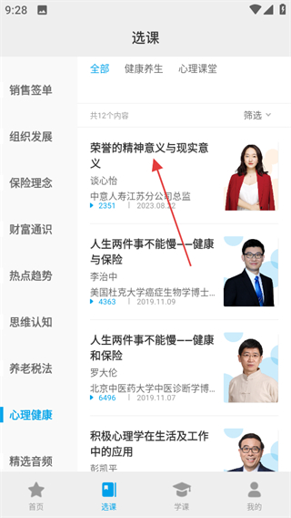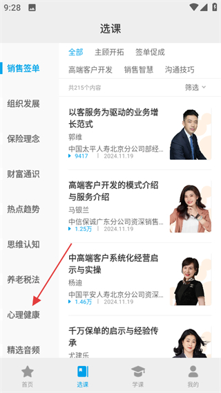 2、在選課頁面,點(diǎn)擊心理健康分類,可進(jìn)入心理健康課程列表頁面。