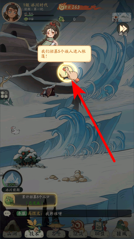 4、游戲內(nèi)出現(xiàn)招募族人的指引時(shí),點(diǎn)擊對(duì)應(yīng)標(biāo)識(shí),即可完成招募,這一步是擴(kuò)充族群人口的直接方式,為文明發(fā)展儲(chǔ)備人力。