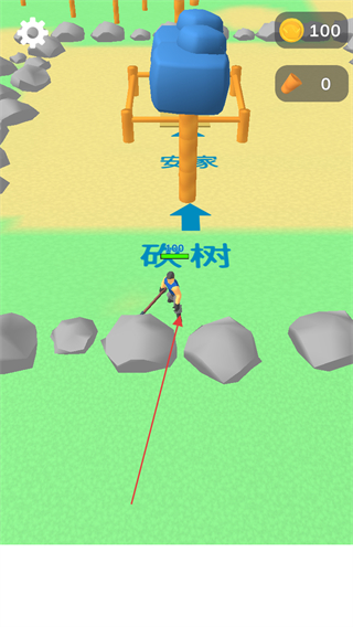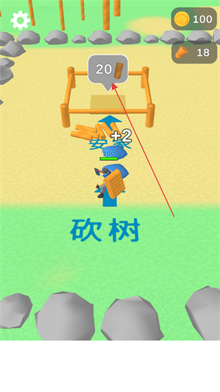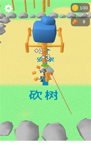 1、操控角色砍樹,獲取木材如每次砍樹可獲得+1、+2、+3等木材,積累木材數(shù)量。
