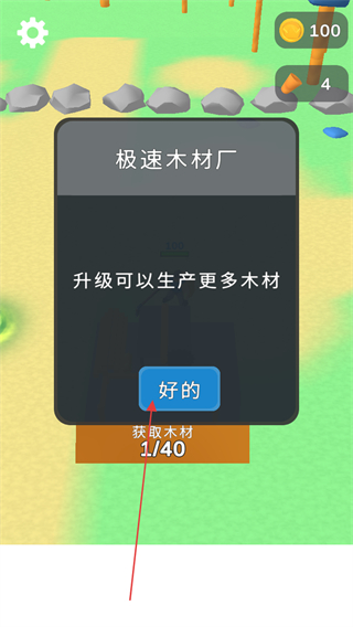 4、持續(xù)砍樹、積累木材、升級建筑,完成木材獲取目標如1/40,逐步推進游戲進程,實現(xiàn)通關(guān)。