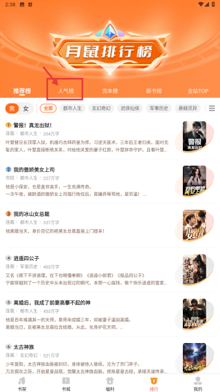 2、在排行頁面,點擊人氣榜選項,瀏覽人氣榜小說列表。