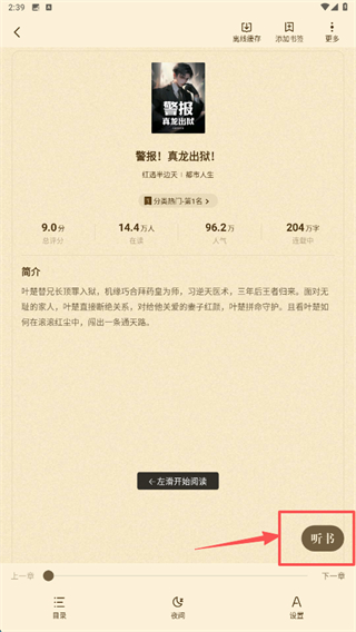 4、在小說詳情頁,點擊聽書按鈕,即可開始聽書。