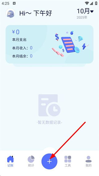 2、在APP首頁(yè),點(diǎn)擊底部藍(lán)色+的按鈕,進(jìn)入支出類別選擇頁(yè)面。