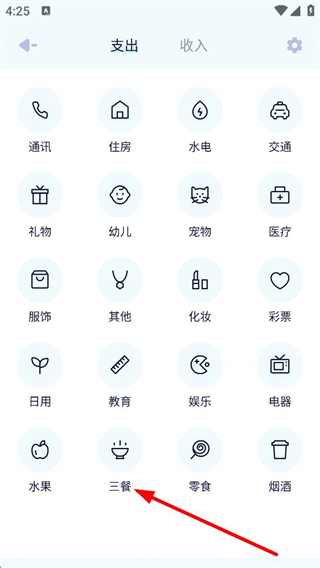 3、在支出類別選擇頁(yè)面,點(diǎn)擊三餐,進(jìn)入支出詳情填寫頁(yè)面。