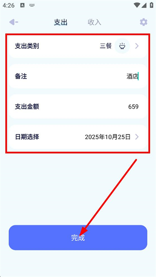 4、在支出詳情填寫頁(yè)面,填寫備注、支出金額、選擇日期后,點(diǎn)擊完成,即可記錄該筆支出。