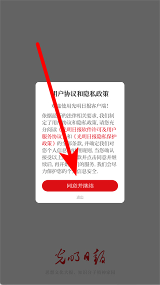 1、打開光明日?qǐng)?bào),在彈出的彈窗中,點(diǎn)擊同意并繼續(xù),進(jìn)入主界面。