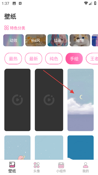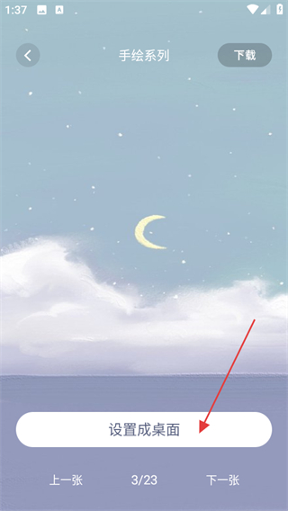 2、在壁紙列表頁面,點(diǎn)擊心儀壁紙如帶有月亮云朵的手繪壁紙,可進(jìn)入壁紙?jiān)斍轫撁妗?