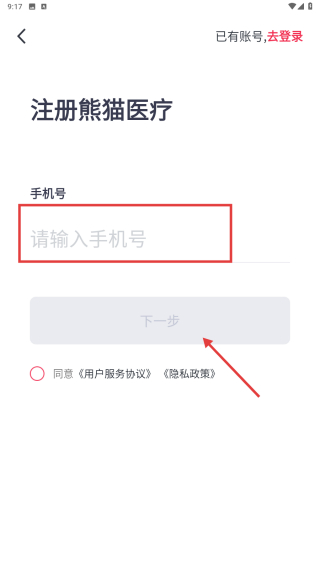 4、在注冊(cè)頁(yè)面,輸入手機(jī)號(hào)后點(diǎn)擊下一步,完成賬號(hào)注冊(cè)操作。