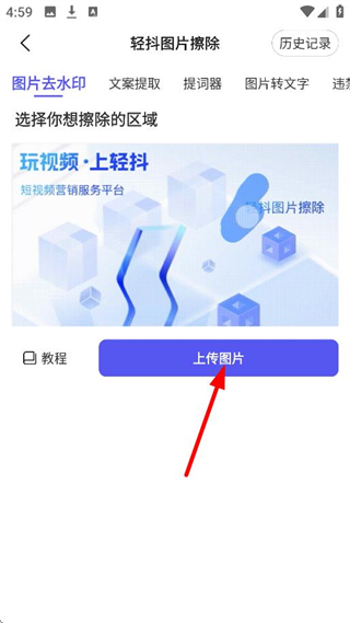 2、在圖片擦除頁(yè)面,點(diǎn)擊上傳圖片,選擇目標(biāo)圖片。
