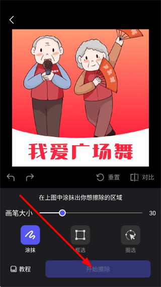 3、涂抹需要擦除的區(qū)域后點(diǎn)擊開(kāi)始擦除,執(zhí)行去水印操作。