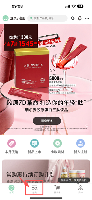 1、打開美妝護膚類應用,點擊底部分類選項,進入分類頁面。