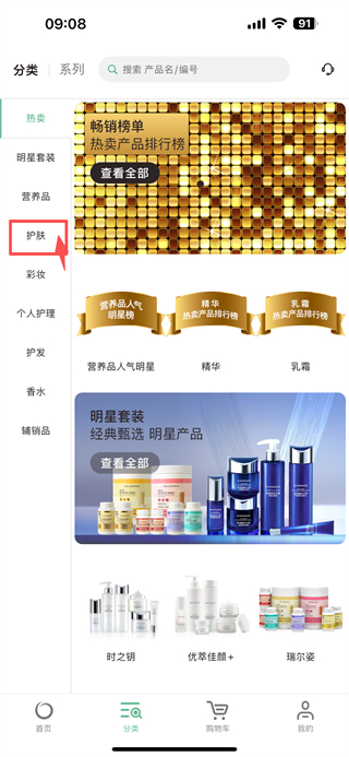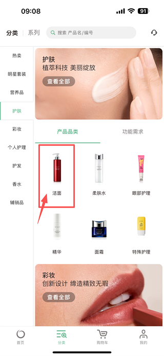 2、在分類頁面,點擊護膚分類選項,進入護膚品類頁面。