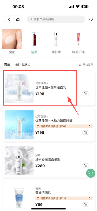4、在潔面商品列表頁面,即可瀏覽各類潔面商品,如優(yōu)萃佳顏+亮妍潔面乳等。