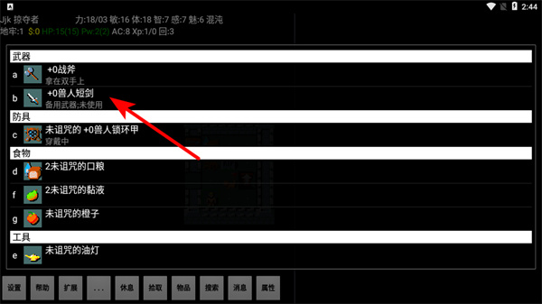 2、進(jìn)入物品界面,查看并選擇武器如獸人短劍,合適的武器能提升戰(zhàn)斗能力,助力敵人。