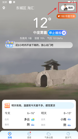 1、打開天氣類應(yīng)用,點擊右上角我的選項,進入個人中心頁面。