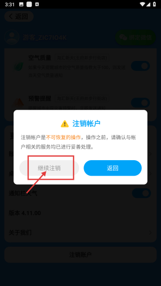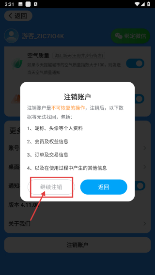 4、在后續(xù)彈出的確認(rèn)框中,再次點擊繼續(xù)注銷按鈕,發(fā)起賬號注銷操作。