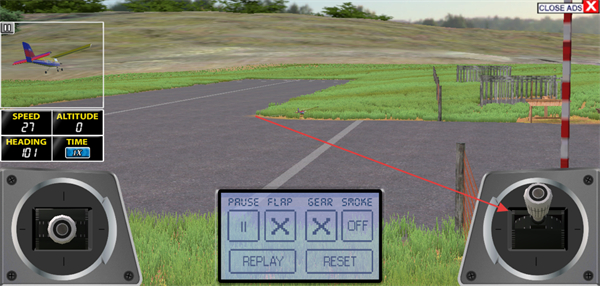 1、操控飛機在跑道上滑行,通過調(diào)整右側(cè)控制桿控制油門,提升飛機速度,準備起飛。