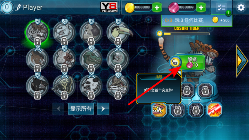 3、在突變體界面,點(diǎn)解鎖按鍵,消耗石可解鎖新的突變體Ussuri Tiger,豐富戰(zhàn)斗選擇。