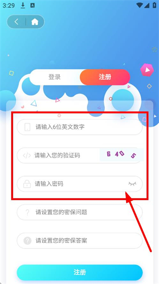 4、在注冊頁面,輸入6位英文數(shù)字、驗證碼和密碼。